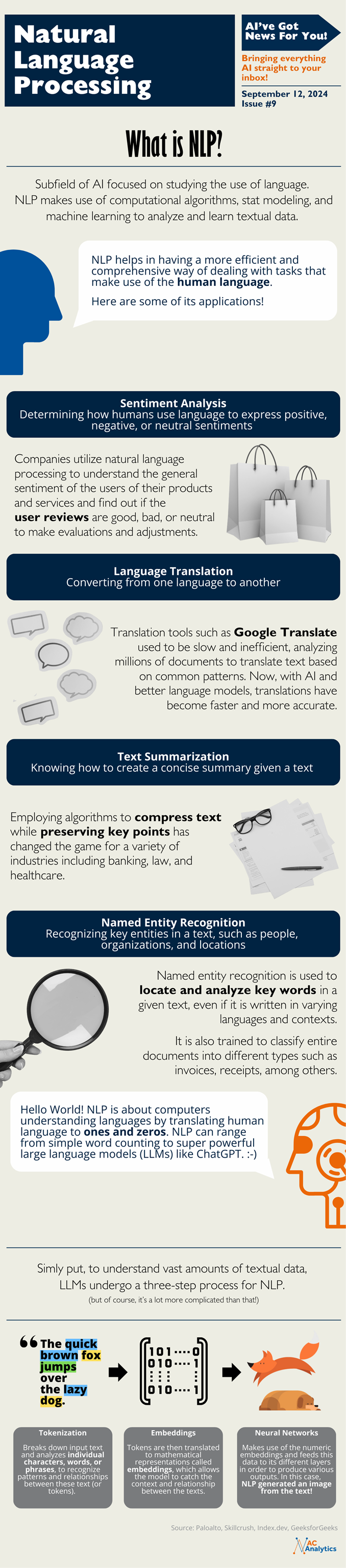 Welcome to this week’s edition for AI’ve Got News For You, where we delve into the concept of Natural Language Processing (NLP) and how it is used by Large Language Models (LLM) to interpret and generate language!