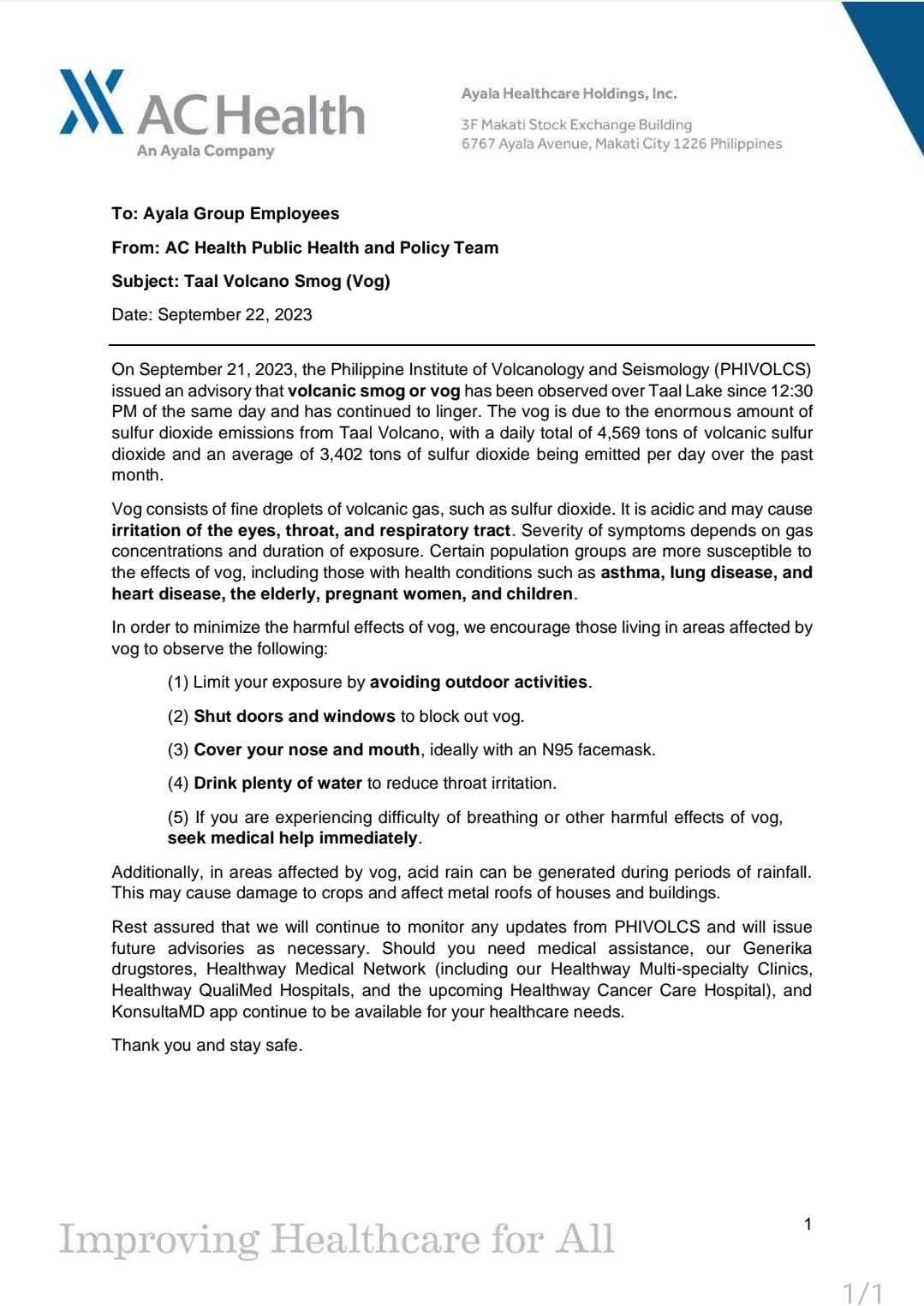 The Company will continue to regularly monitor the on-going Ashfall and Volcanic Activity and trigger Crisis Communication whenever necessary. Always keep in mind that Employees’ Welfare and Safety is the Company’s primary concern. This will continue to be the general guideline we should all practice during situations like this.