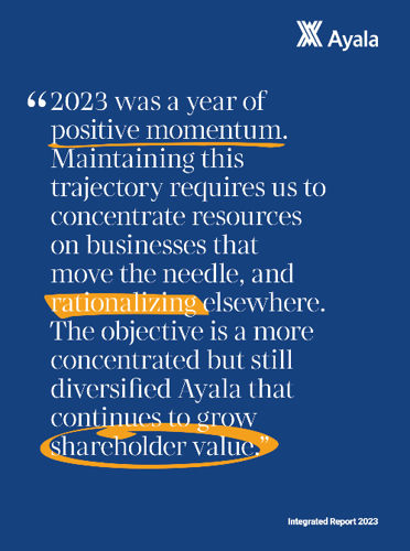 “We are going to double down on the winners in terms of capital and other resources to the extent that they need it. We are going to reconfigure internally or via business combination those businesses that need such adjustments, and we’re going to exit businesses where we see little competitive advantage or have limited ability to scale. Freed capital will be recycled. Capital raised by Ayala Corporation will be provided in size to the winners or clear potential winners. We want to create the next Manila Water, or ACEN, or Mynt. After all these moves, you’ll see a more concentrated, but still broad and hopefully more valuable Ayala Corporation.” CEZAR P. CONSING