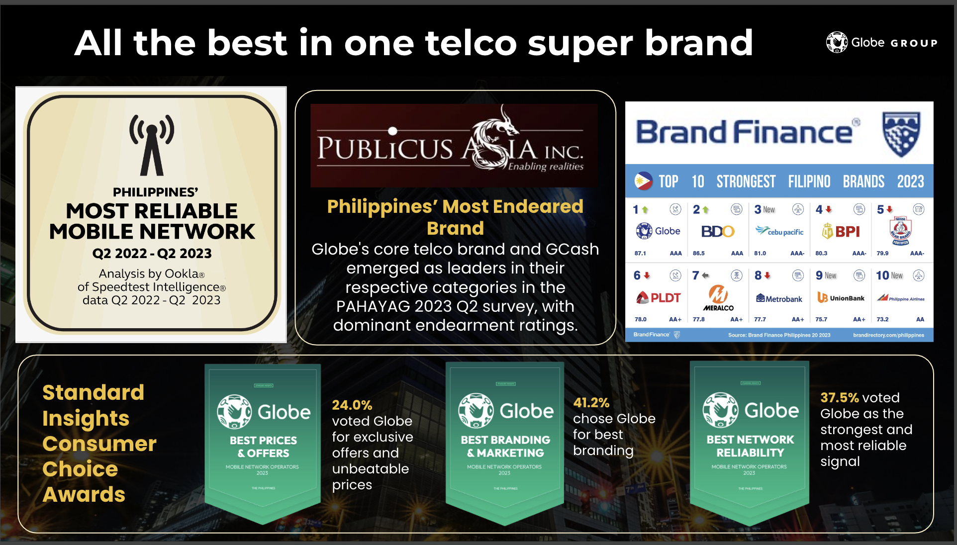The company has also been named the Philippines' strongest brand by Brand Finance, with an impressive AAA brand strength rating and a brand value of $2.028 billion. Similarly, PUBLiCUS Asia’s PAHAYAG 2023–Q2 survey named Globe's core telco brand and its affiliate GCash as leaders in their respective categories, with dominant endearment ratings.