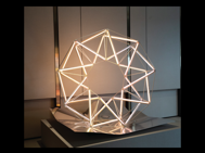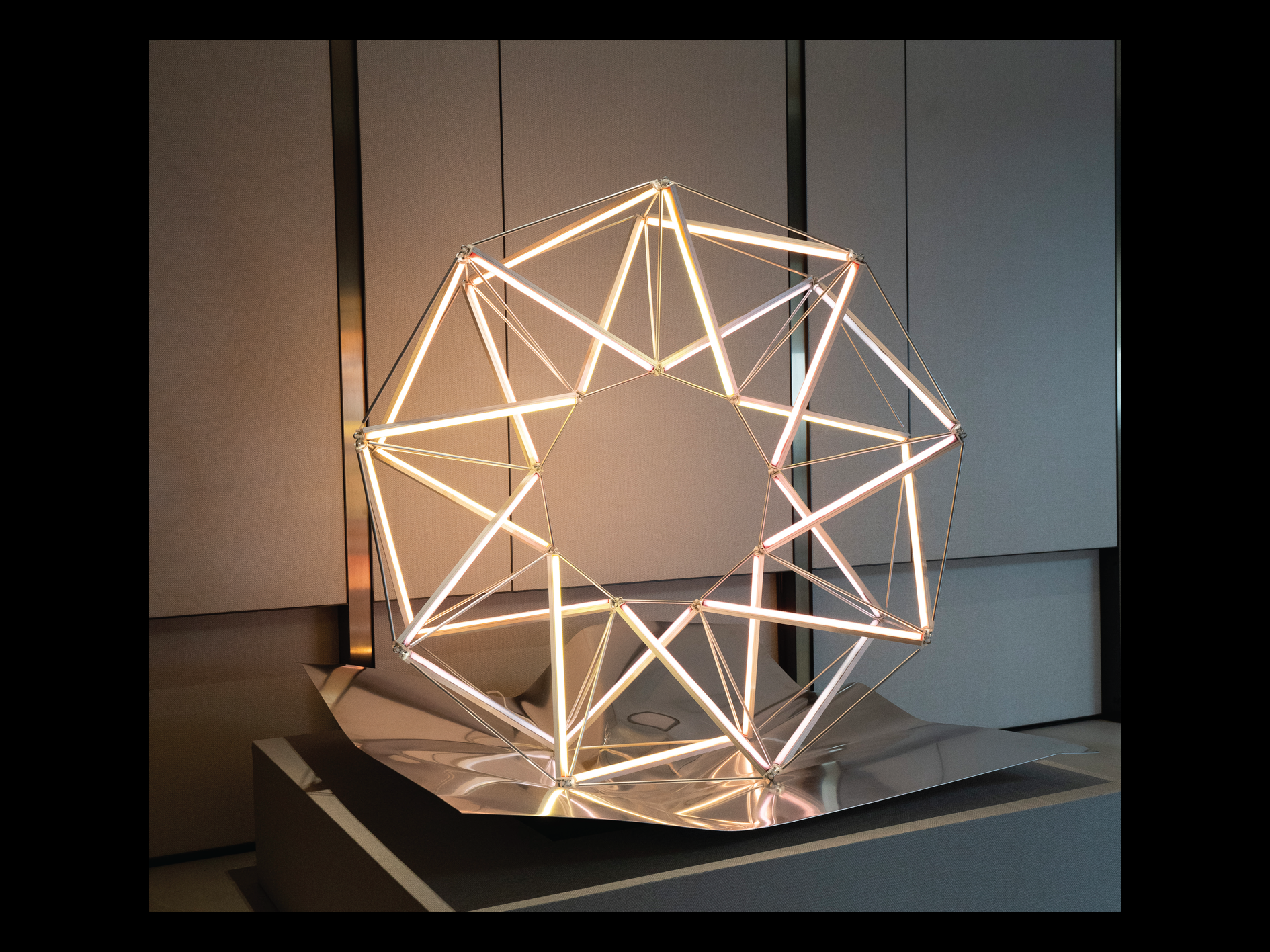 Magwheel Day takes the shape of a semi-truck wheel (made of LED lights with color filters representing daytime) resting on an aluminum sheet (crushed by weights dropped by Hidilyn Diaz). The sculpture represents the magwheels used by Diaz prior to having access to professional equipment. It can be read as the representation of ingenuity, work, and the struggle for success despite circumstances.