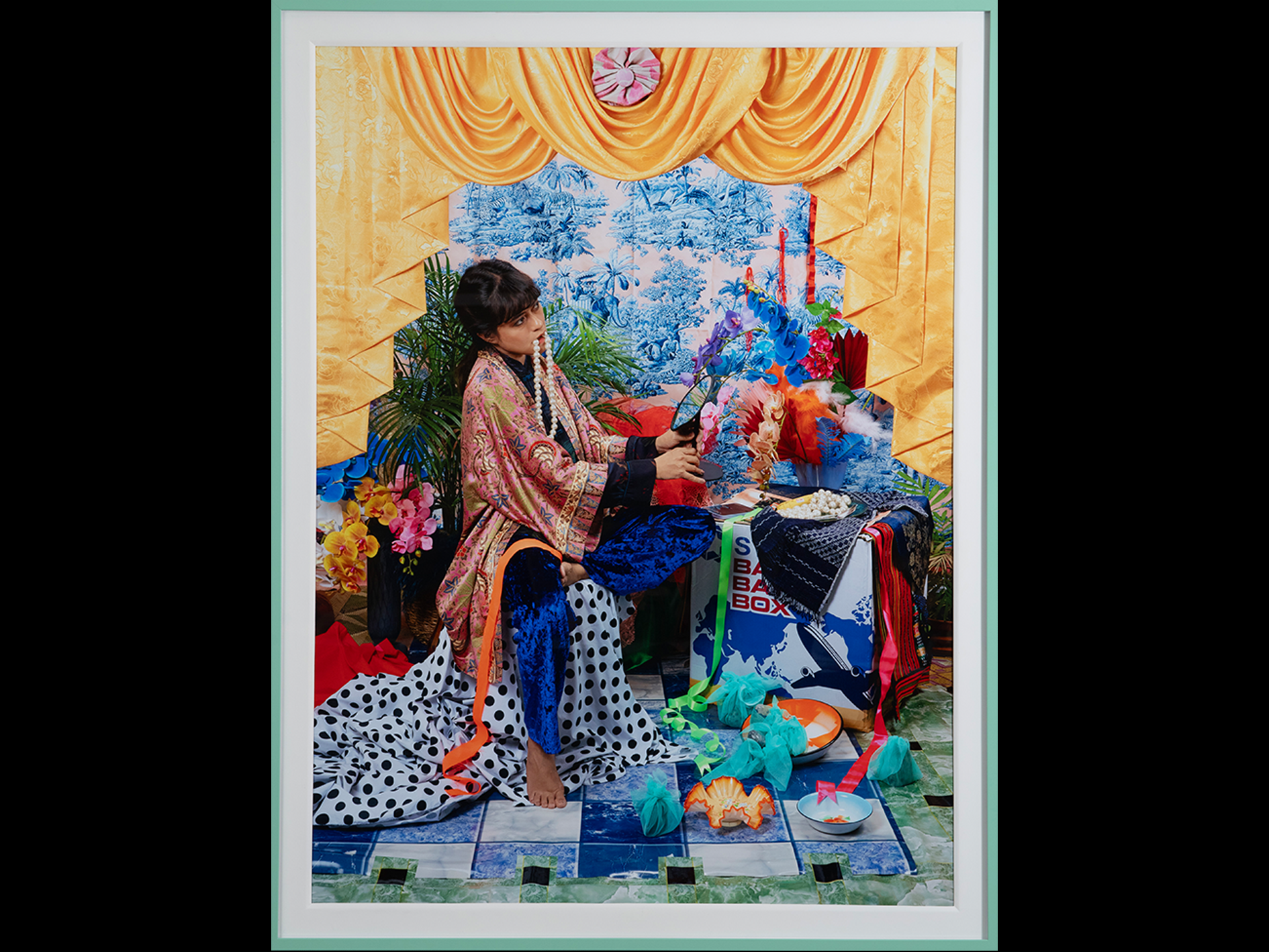 The Philippines has been referred to as “The Pearl of the Orient”; curiously, Istanbul/Türkiye, the place where the artist was living at the time of the creation of this artwork, was historically also called the same. In this colorful self-portrait, Navarroza plays with Orientalist tropes of the imagined “East” and the exotic “Other” by placing herself as the oriental odalisque gazing at herself in the mirror. She subverts the stereotype with a chain of pearls in her mouth and a riddle-like arrangement of symbolic objects around her: a balikbayan box, patterns and textiles from different origins, the mint green-colored bundles signifying pasalubong gifts from far away. The artist pays homage to Filipinos as transnationals, the OFWs (Overseas Filipino Workers), the migrants, the Filipinos in diaspora.